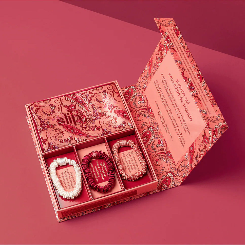 Luxusní limitovaná sada obsahuje 1x hedvábný povlak na polštář a 3x hedvábné skinny scrunchies.